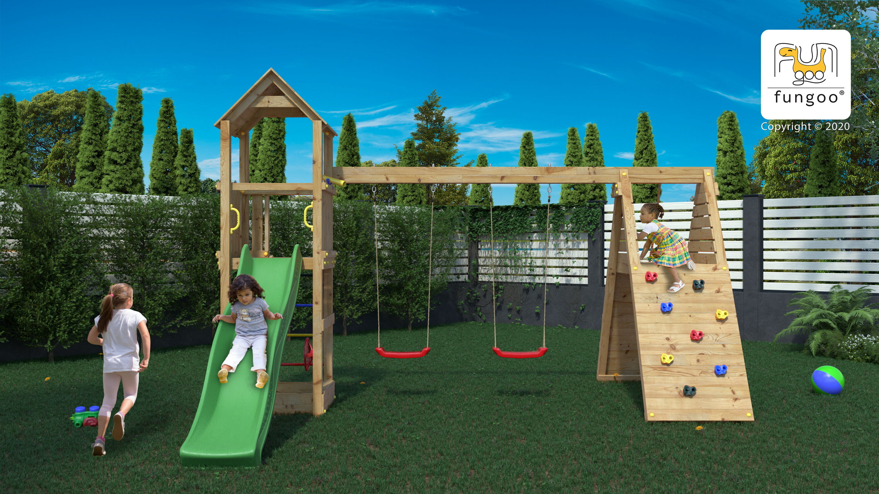 Pour le bonheur des enfants : portiques, toboggans, balançoires, cabanes, maisonnettes, bacs à sable, etc.